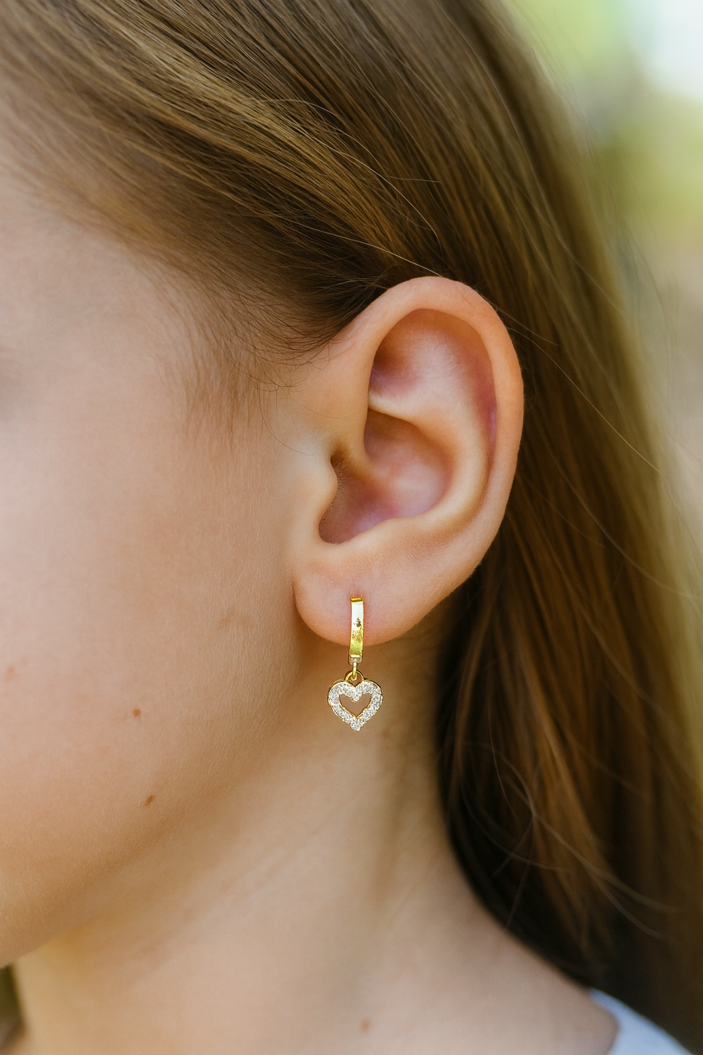 Bu zarif kalp charmlı çocuk küpesi, miniklerin hassas kulakları için özel olarak tasarlanmıştır. 7 mm iç çapa sahip halka, 6 mm ölçüsündeki kalp charm ile birleşerek sevimli ve şık bir görünüm sunar.