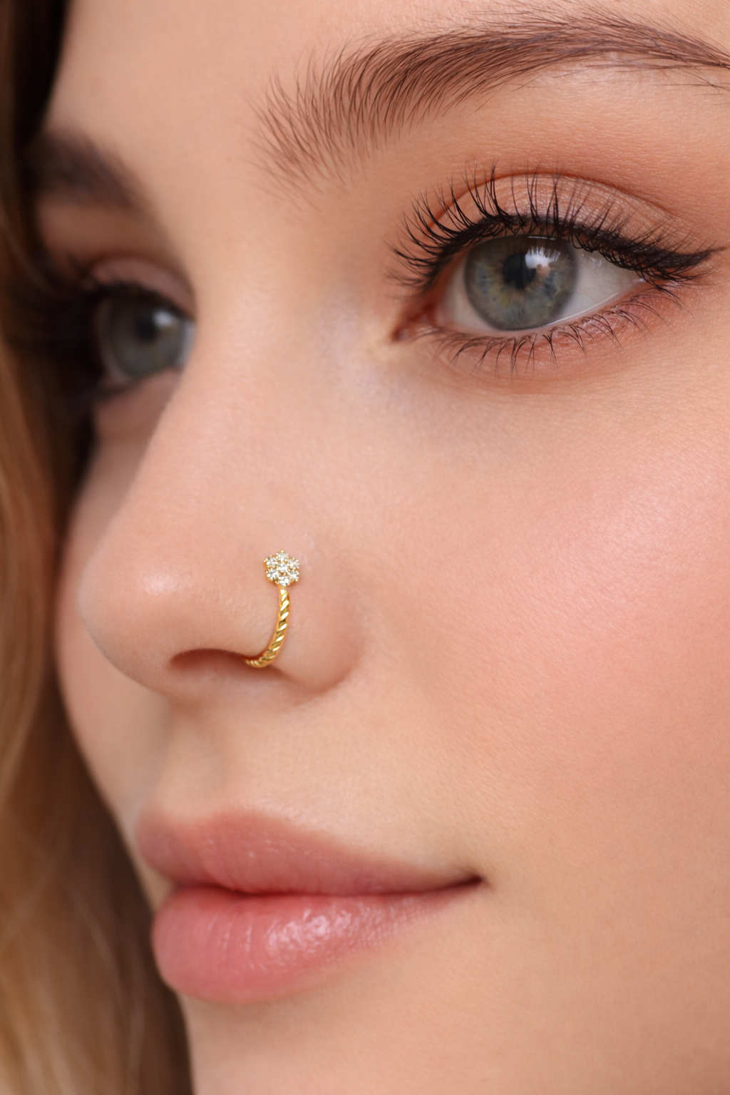 Sıkıştırmalı burun hızması olarak tasarlandı ancak kıkırdağın üst kısmında sıkıştırmalı küpe olarak da kullanılabilir.